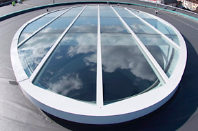 Shown above right is an impressive 9 m long elliptical rooflight which forms the central focus of Bristol’s new Eastgate Oriental Centre. Here, a large copper clad drum contains a sweeping main staircase leading to a first floor gallery. This area is lit by the dramatic, elliptical oculus rooflight set within the shallow monopitched roof of the copper drum. Xtralite worked with the architects to develop an optimum structural and glazing solution to minimise rafter size, with perimeter cover flashings concealing both the construction and drainage route.